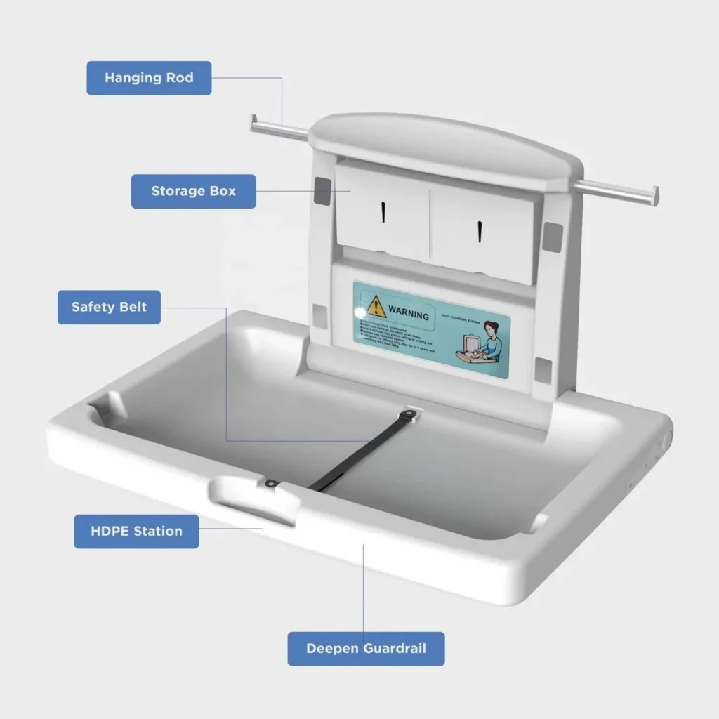 جای تعویض پوشک تاشو مدل DK105 جزو تجهیزات رفاهی نوزادان بوده که برای استفاده در سرویس بهداشتی های عمومی طراحی شده است. این محصول دارای بدنه آنتی باکتریال و ضد مکیروب می باشد که از رشد هرگونه قارچ و میکروب بر روی آن جلوگیری می نماید. این محصول بگونه ای طراحی شده است که در اتمام کار به راحتی جمع شده و فضای بسیار کمی را در محیط اشغال می کند. همچنین دارای محل نگهداری لوازم بهداشتی، کیف، نایلون زباله و ... بوده و قابلیت تحمل وزن کودکان تا 30 کیلوگرم را دارا است.