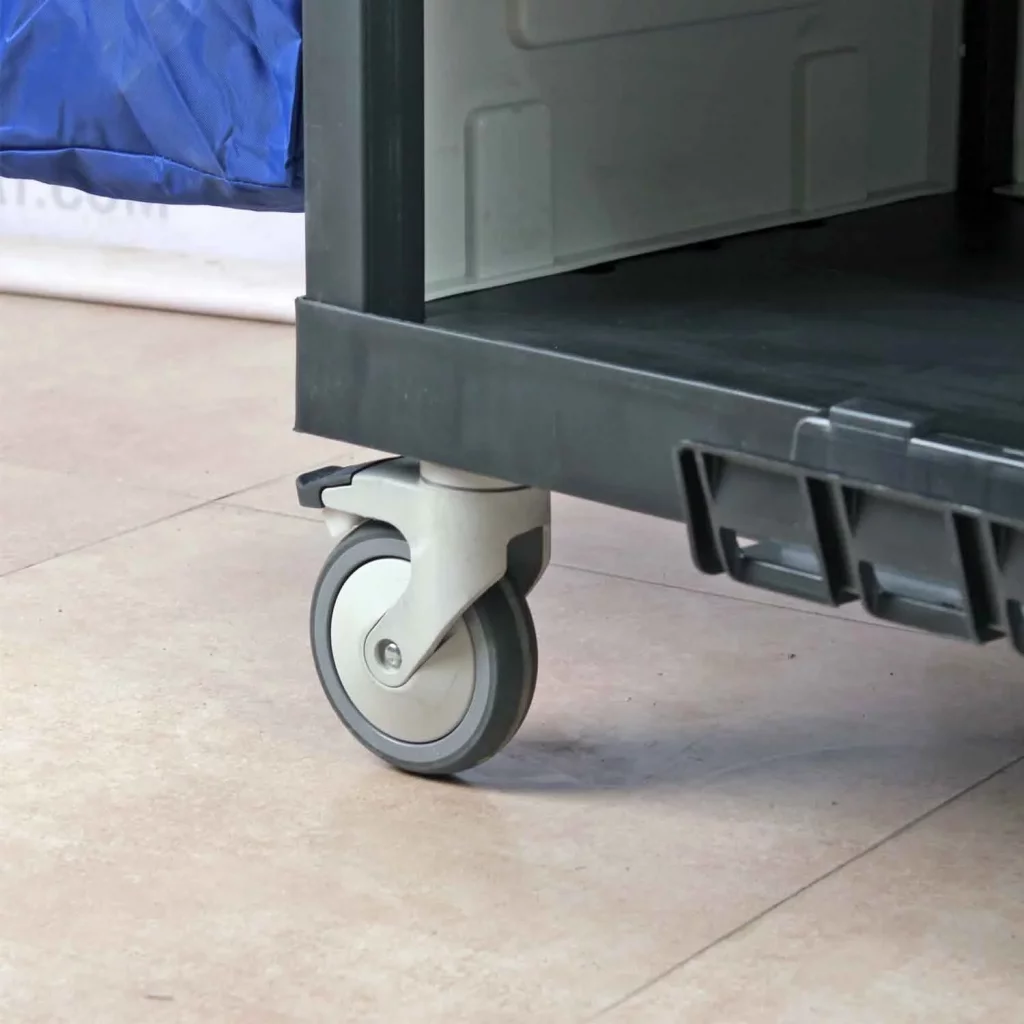 برای اینکه پرسنل بتوانند به راحتی و بدون ایجاد مزاحمت برای مهمانان در راهروها حرکت کنند، ترولی STAFF 1561 به چرخهای ژلهای و بلبرینگی با کیفیت بالا مجهز شده است. این چرخها کاملاً بیصدا هستند و به آسانی بر روی انواع سطوح، از جمله موکت و سرامیک حرکت میکنند. همچنین، یک سیستم ترمز روی چرخها وجود دارد که به تثبیت ترولی در سطوح شیبدار کمک میکند. 4 عدد چرخ این مدل گردان بوده و 2 چرخ آن ترمز دار است که حرکتی کاملا روان و بی صدا را دارا می باشند.