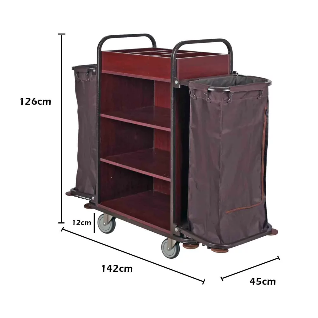 با وجود 2 عدد بین برزنتی و 3 طبقه مجزا این ترولی هیچگونه کمبودی در فضای ذخیرهسازی ندارد و تمام ابزارهای مورد نیاز یک پرسنل خانهداری را در خود جای میدهد. قفسههای متعدد و جادار برای نگهداری حولههای تمیز، لوازم بهداشتی و اقلام مصرفی اتاقها مورد استفاده بوده و بین برزنتی نیز برای جمعآوری ملحفههای کثیف و زبالهها طراحی شده است.