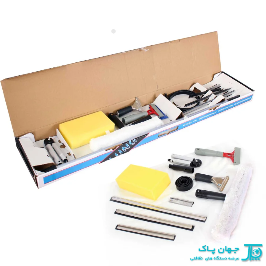 • اجزای ست: دسته تلسکوپی 2.5 متری، سه تیغه (25، 35، 45 سانتیمتر)، لاستیک اضافه 92 سانتیمتر، تیغه تمیزکننده دستی، اسفنج پاککننده، پد ابری با پایه، سری تاشو زاویهدار