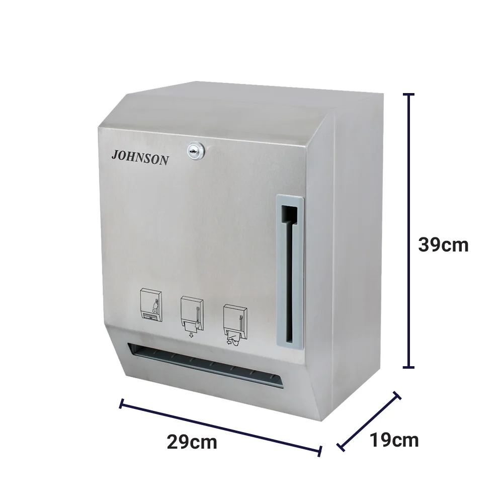 جا دستمال کاغذی مدل 20 برند جانسون برای مکانهای عمومی مانند سرویسهای بهداشتی هتلها، رستورانها، بیمارستانها، ادارات، بانکها و سایر محیطهای پرتردد طراحی شده است. علاوه بر این، قابلیت استفاده دستمال رولی با عرض 20 سانتیمتر، استفاده از این دستگاه را برای اماکن عمومی پر کاربرد نموده است.