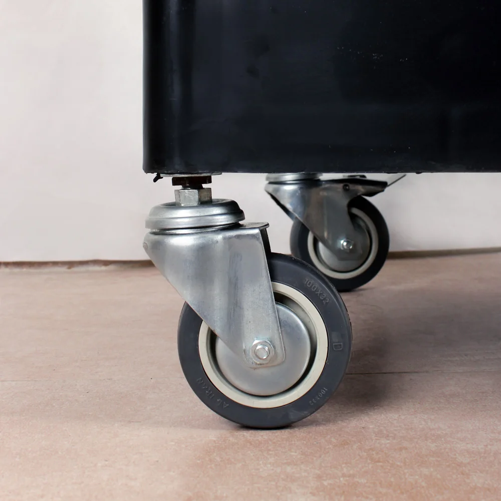 ترالی گود مدل 6320 مجهز به 4 عدد چرخ مقاوم و بیصدا است که 2 عدد از آنها دارای ترمز هستند. این چرخها با قطر 10 سانتیمتر، حرکت نرم و آسانی را حتی در سطوح ناهموار فراهم میکنند. وجود ترمزها نیز امکان ثابت نگهداشتن ترالی در مکانهای شیبدار یا در حین بارگیری و تخلیه را فراهم میکند.