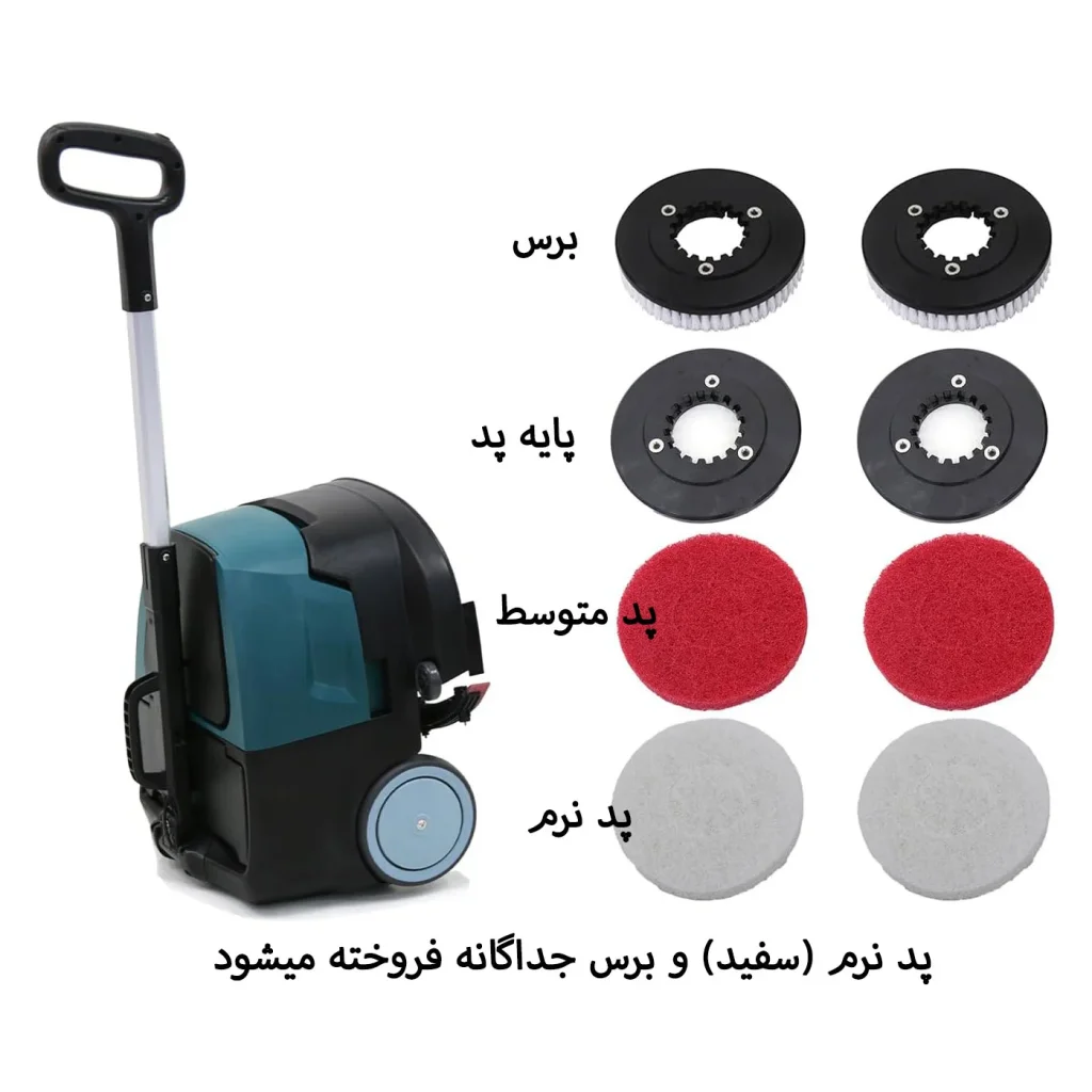 همراه با دستگاه یک پد با زبری متوسط جهت نظافت سطوح سنگ، سرامیک و موزاییک ارسال می گردد. همچنین در صورت نیاز به مدل نرم برای سطوحی مانند پارکت چوبی می تواند آن را نیز در هنگام خرید سفارش دهید. نصب پدها بسیار راحت بوده و با یک فشار در سرجای خود قرار می گیرد. در بسته بندی این محصول یک جفت پد قرمز (استاندارد)، یک جفت پد سفید (نرم) و یک جفت فرچه برای سطوح بسیار حساس و پولیش زدن تعبیه گردیده است.