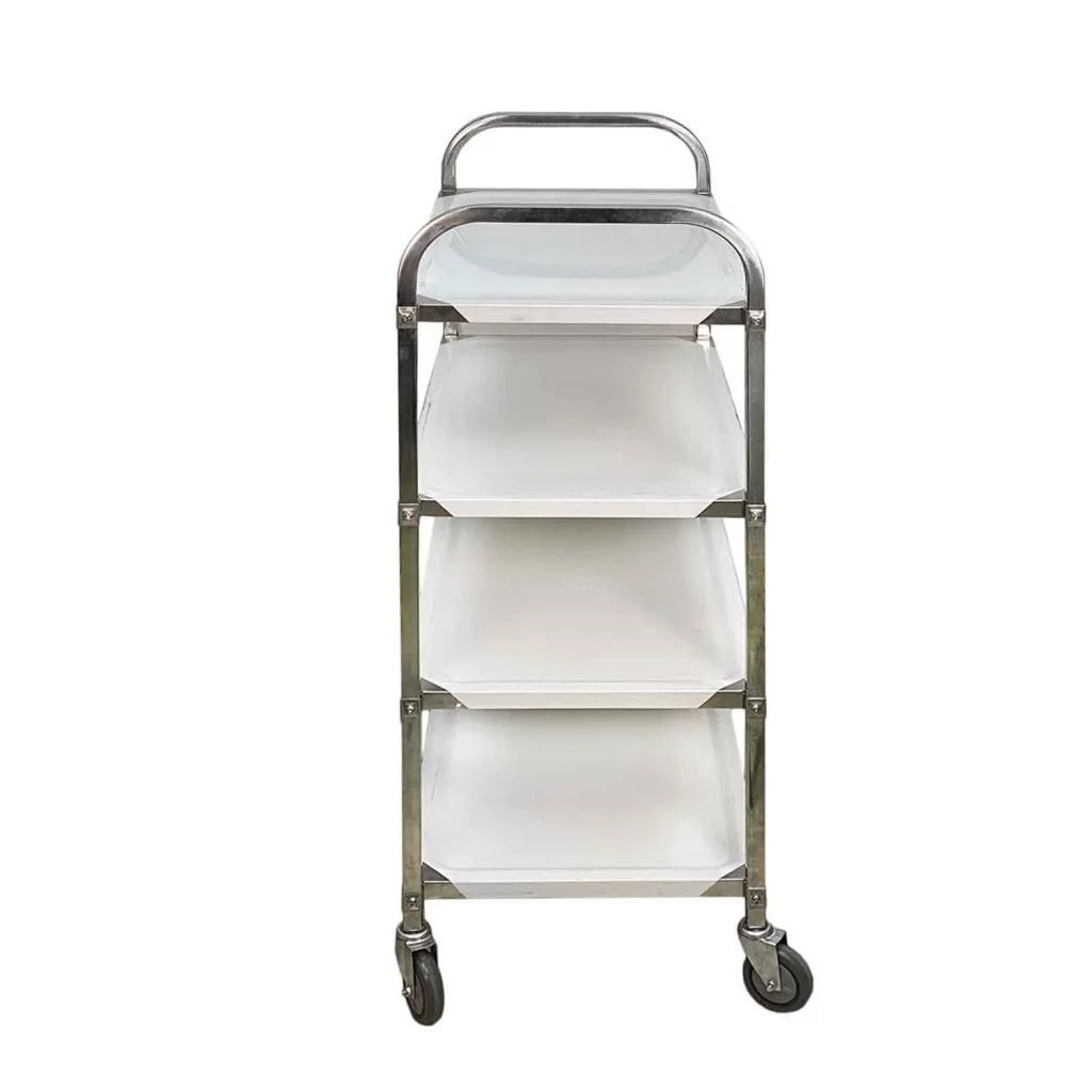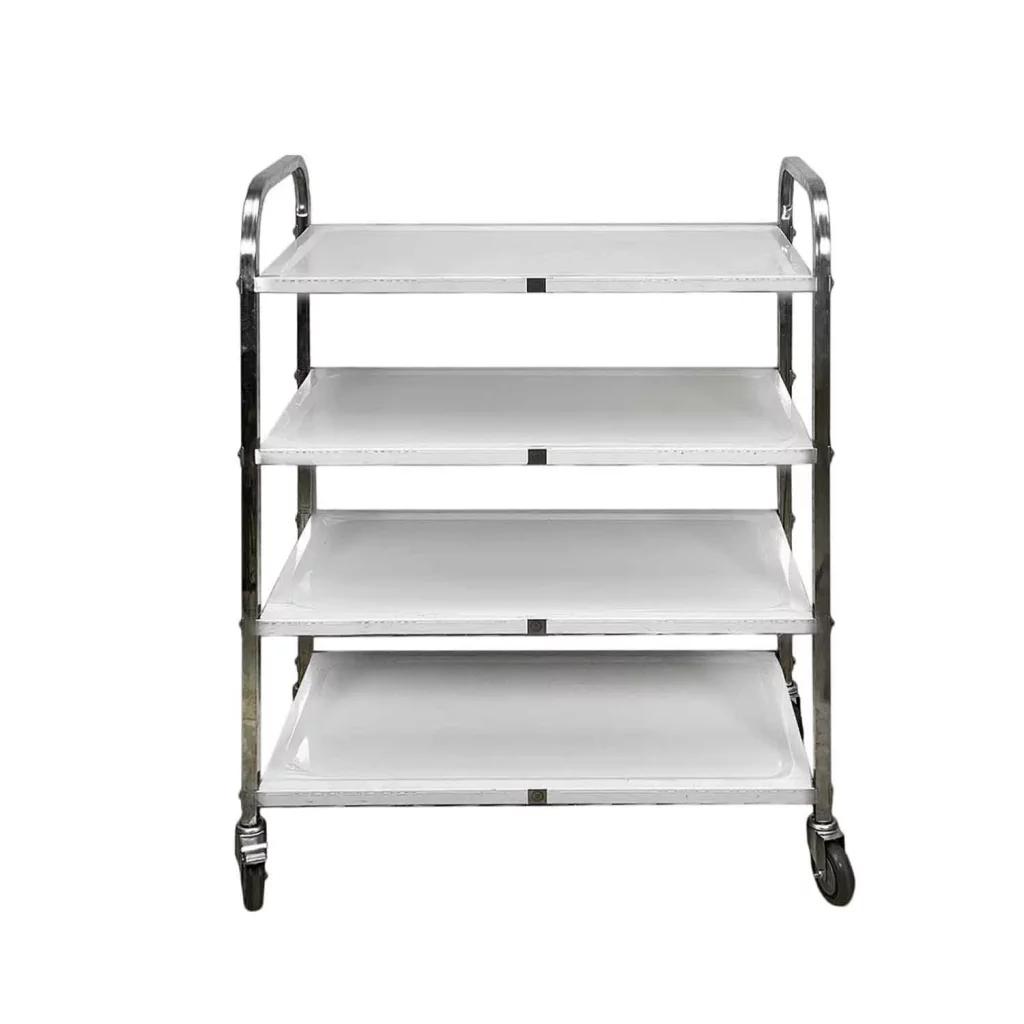 طبقات این ترولی تماما از جنس استیل ضد زنگ و کاملا مقاوم تولید شده است. این ویژگی سبب می گردد تا ترالی بدون تغییر حالت میزان مشخصی از بار را تحمل نموده و کارایی مناسبی را ارائه دهد. همچنین ارتفاع در هر طبقه حدود 27 سانتیمتر در نظر گرفته شده است تا بتوان تمامی تجهیزات مورد نظر را در داخل آن قرار داد.